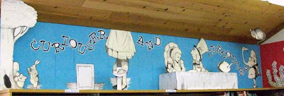 This is the current bulletin board in our children's department here at the Cambria Library. "Alice in Wonderland" - done by my colleague Destiny Carter. Using the John Tenniel illustrations from the original edition, she drew them in various sizes and put them together with playing cards of different dimensions and 3-D tables.